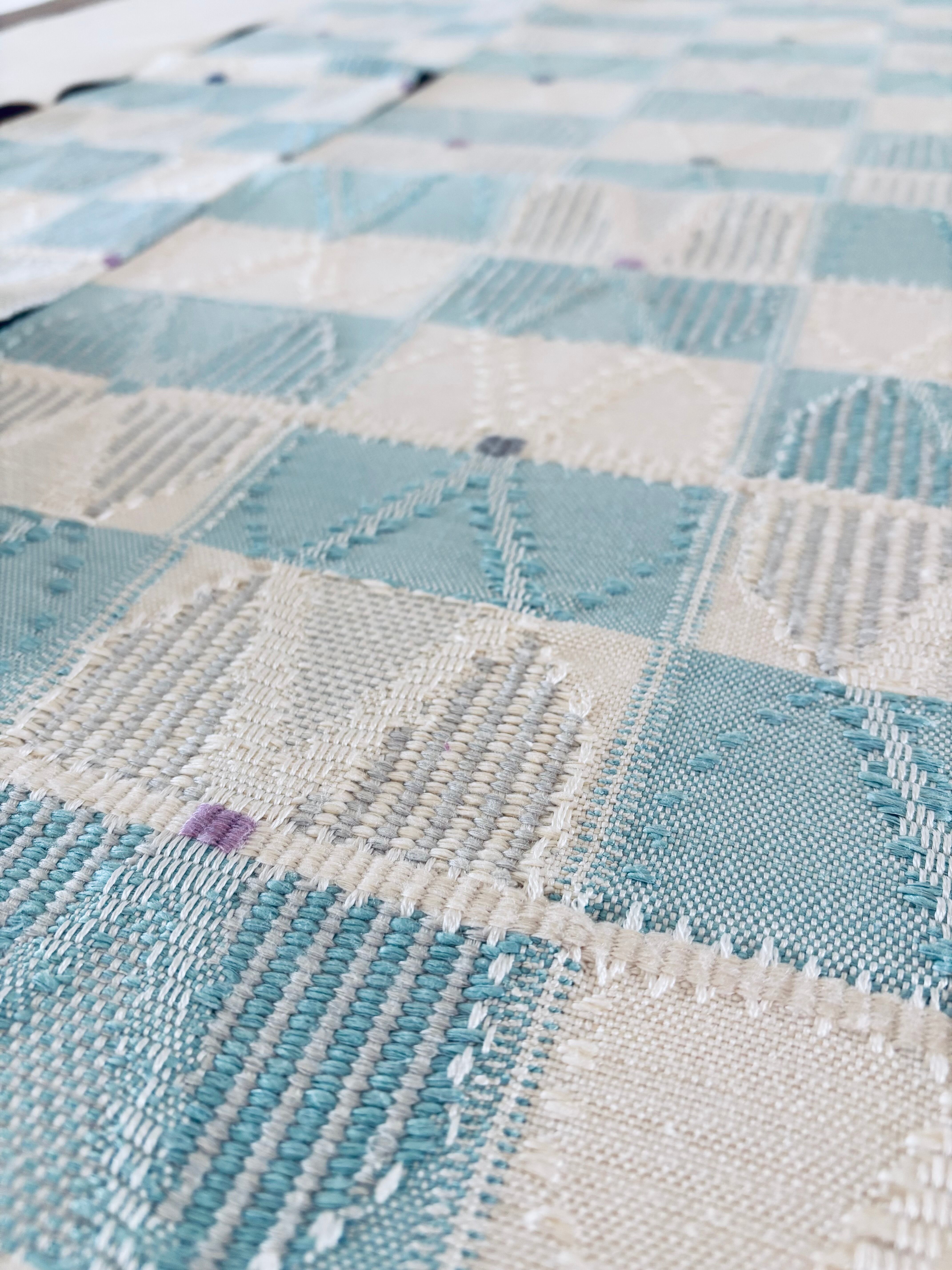 水色と白の変わり市松模様に紺や紫のドットが可愛い八寸帯です。