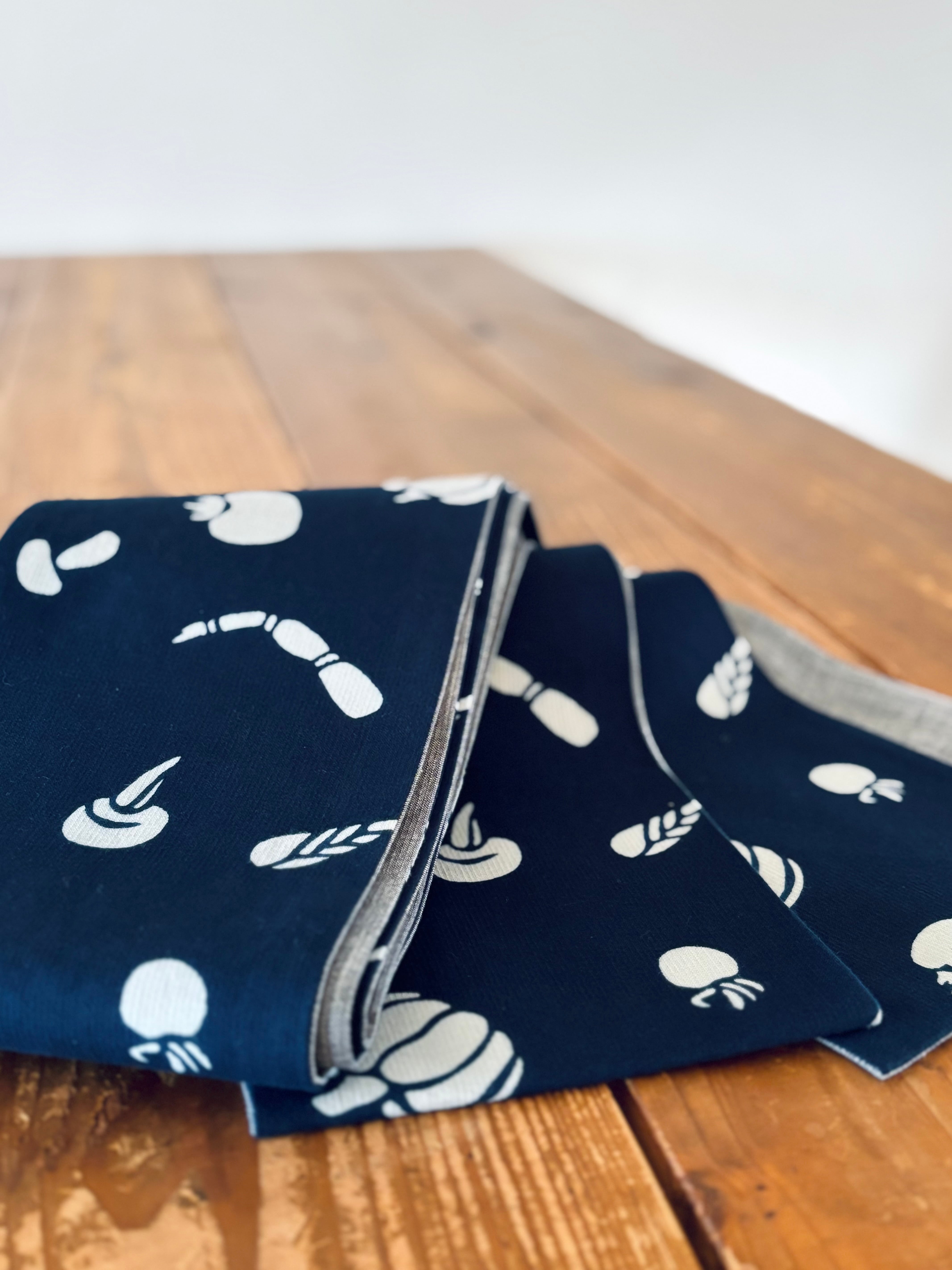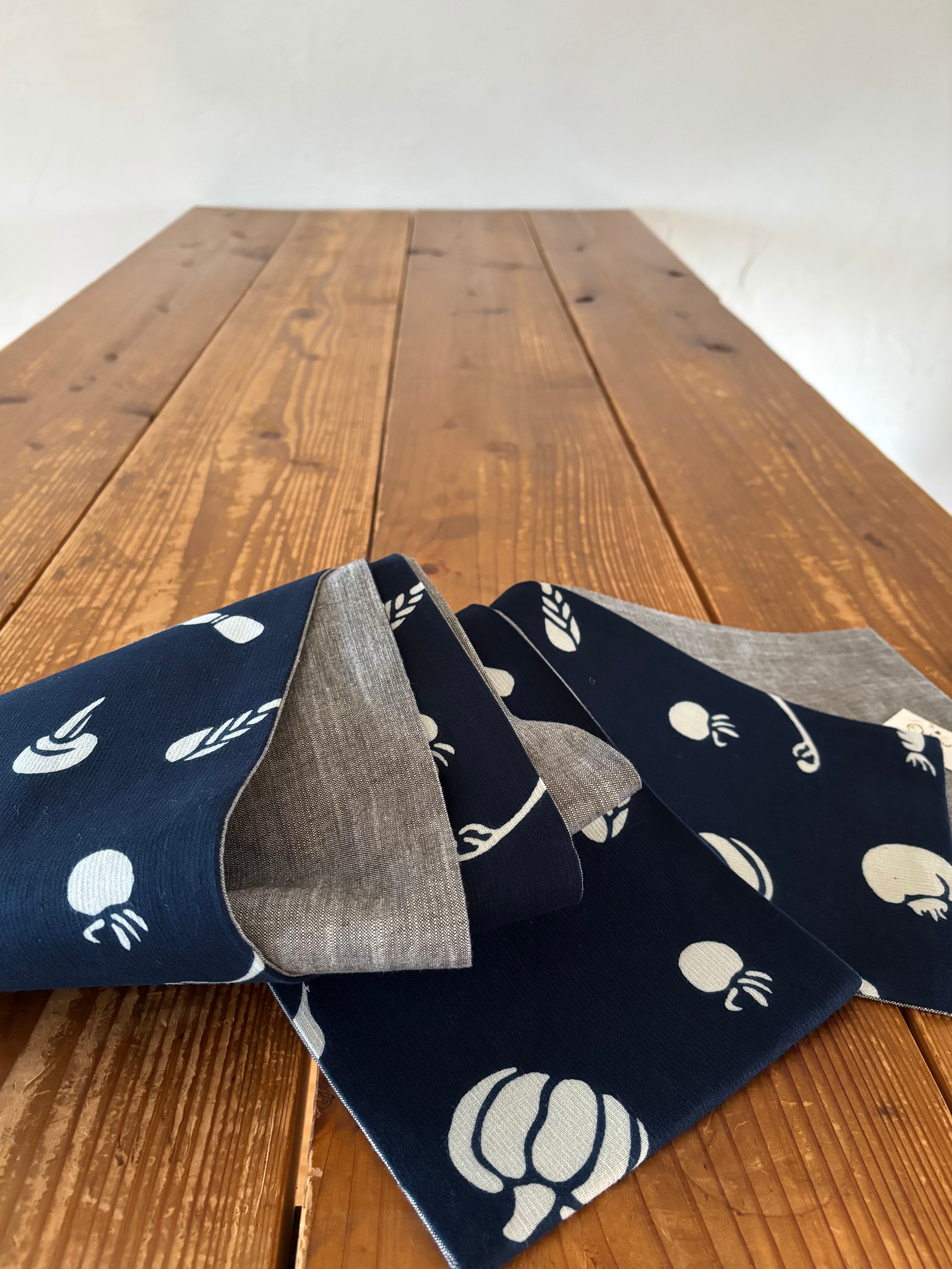 紺地に白の野菜、裏面は杢グレーの無地というシックな配色です。