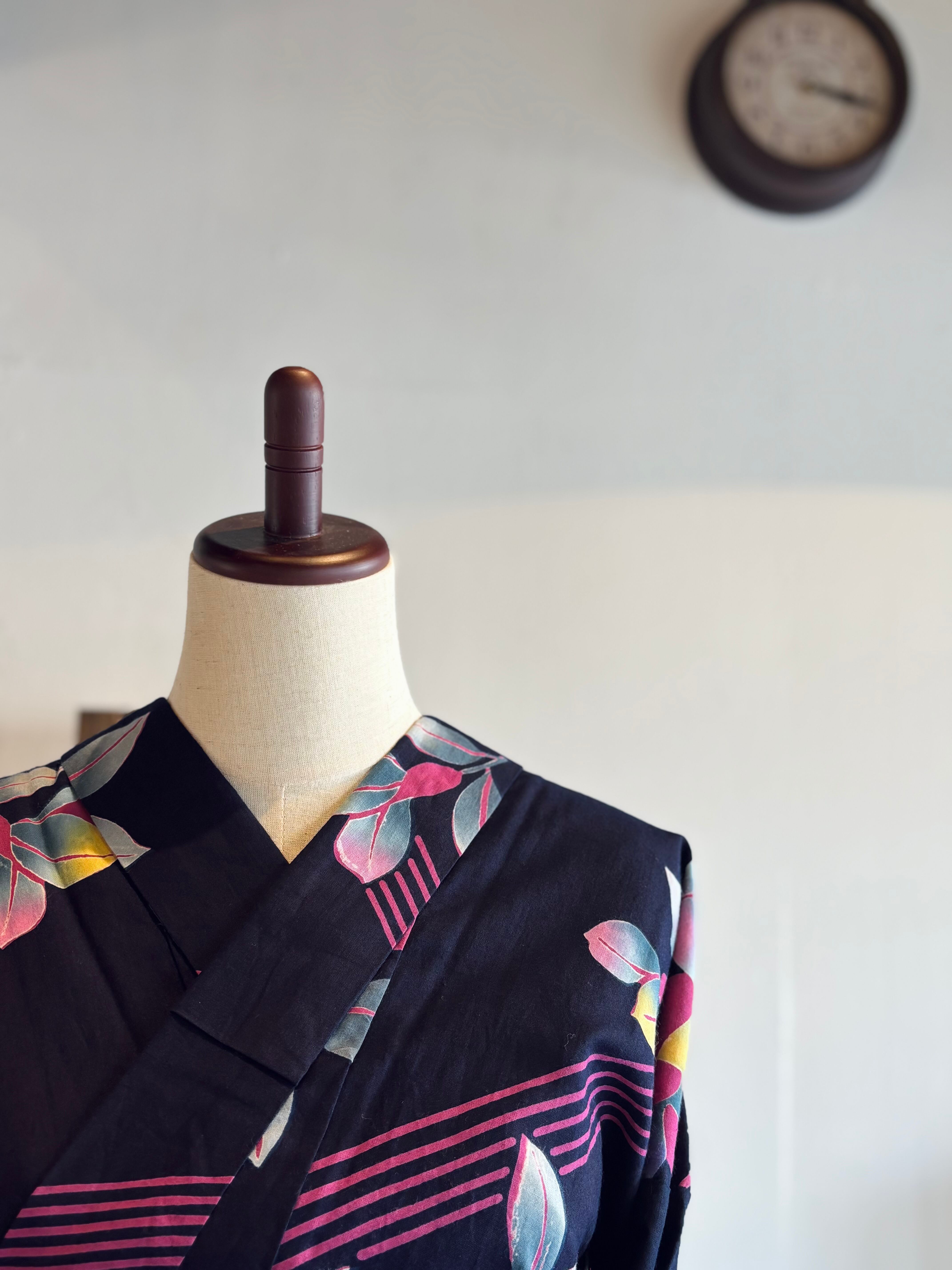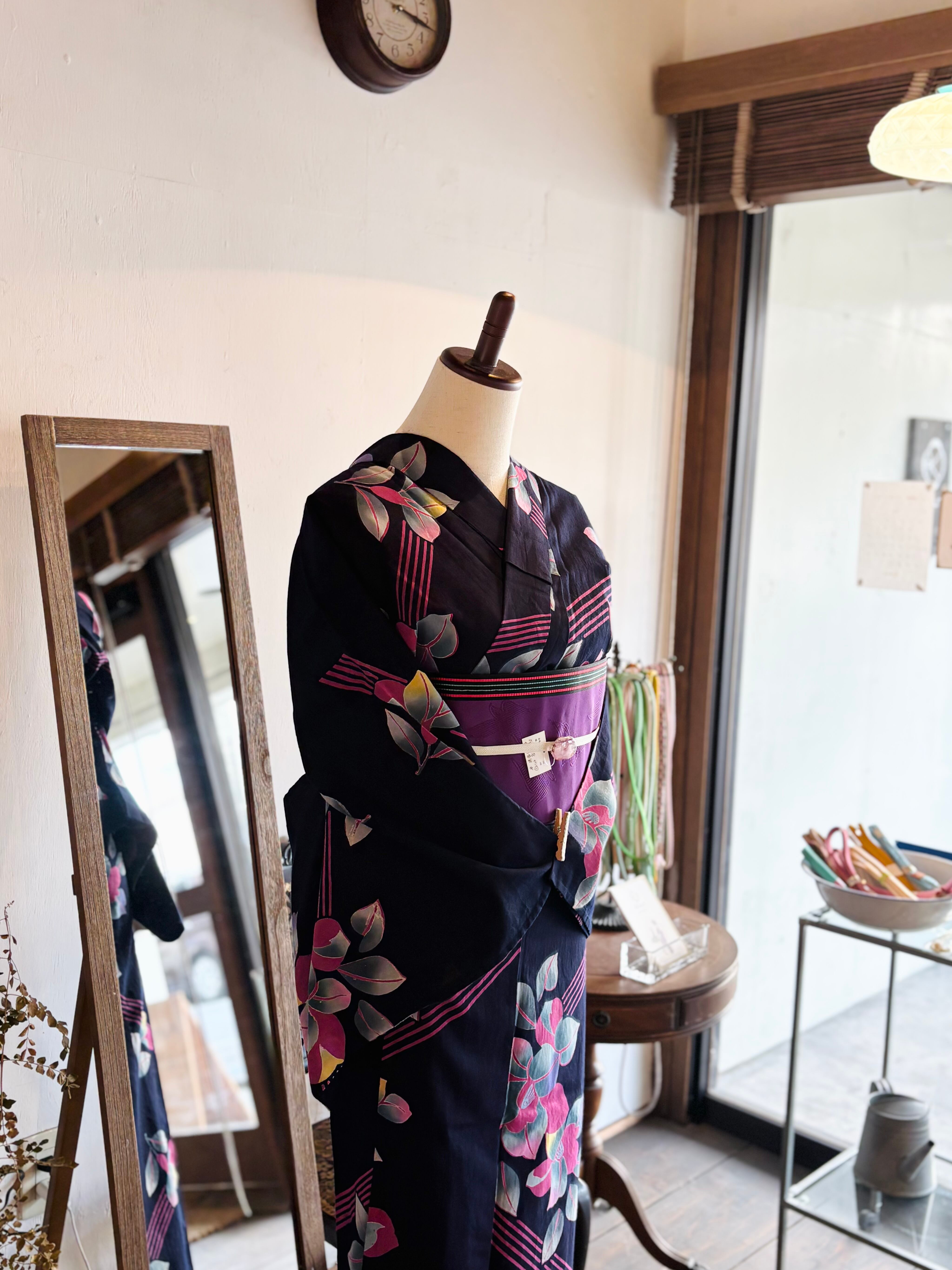 茄子紺のコーマ地にローズピンクとブルーグレーの椿が描かれた注染の浴衣。