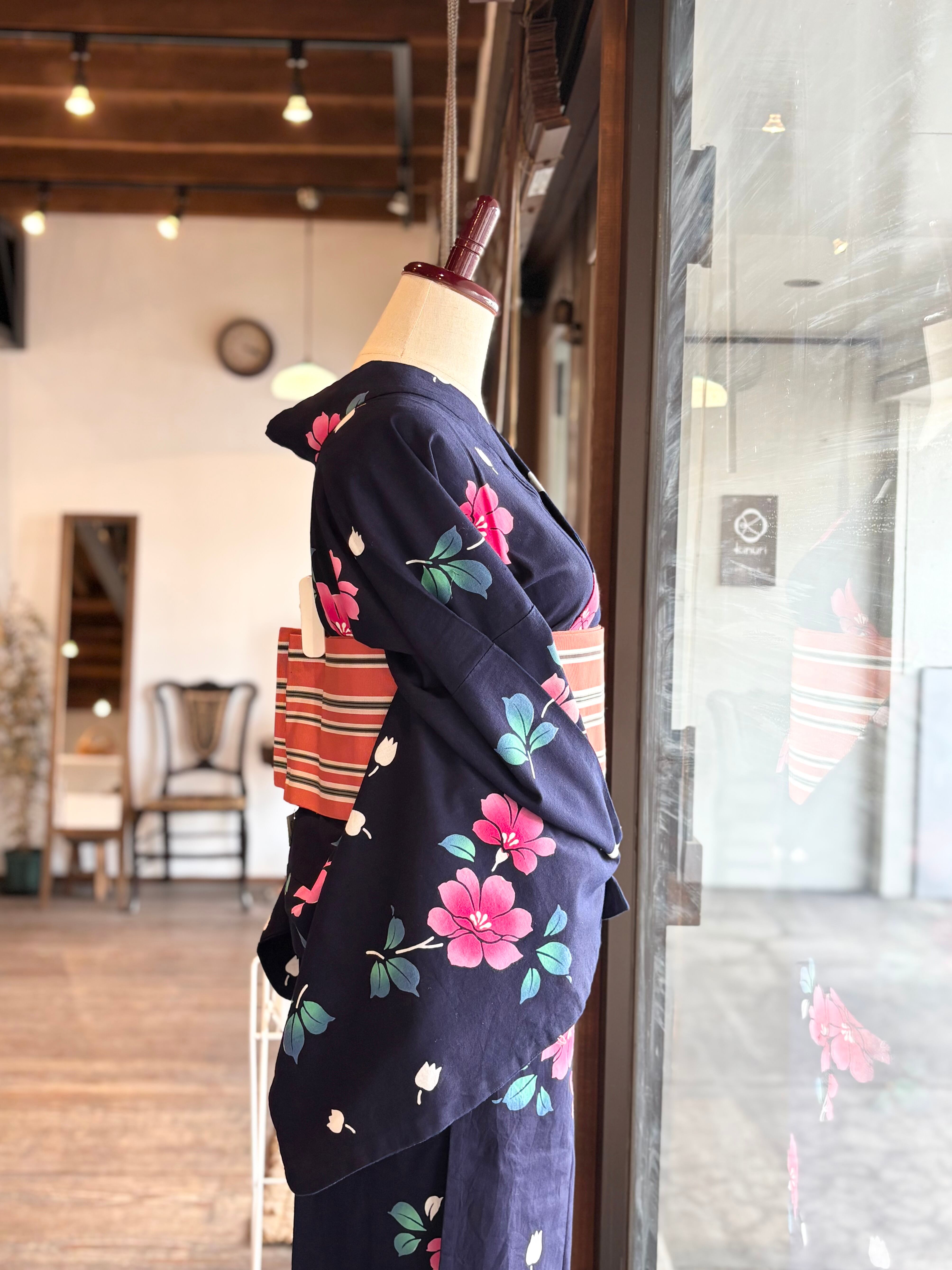 紺のコーマ地にとっても可愛らしい花が描かれた注染の浴衣です。